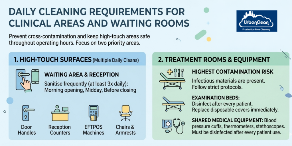 Daily cleaning in medical centres prevents cross-contamination between patients and keeps high-touch areas safe throughout operating hours. To maintain this protection, focus on two priority areas. First, high-touch surfaces require frequent attention. Second, treatment rooms carry the highest contamination risk.